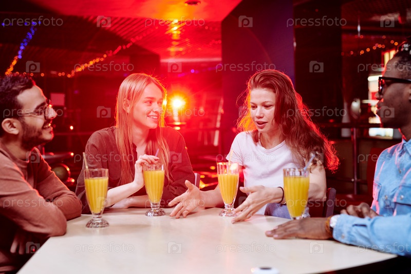 Две молодые межкультурные пары, сидящие за столом в кафе в центре досуга