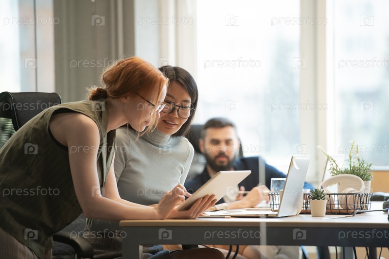 Молодая азиатская бизнесвумен и ее коллега смотрят на дисплей планшета