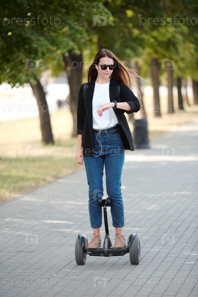 Молодая элегантная бизнесвуменка смотрит на наручные часы во время езды по гироскопу
