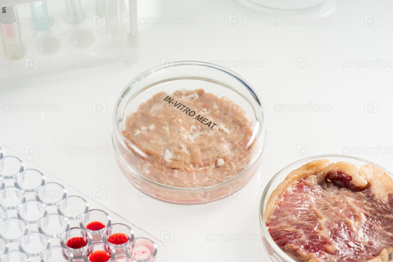 Небольшой кусок сырого мяса in vitro и животного происхождения, стоящего на столе