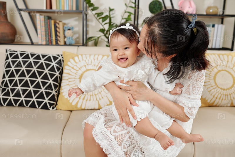 Мать целует улыбающуюся дочь на щеку
