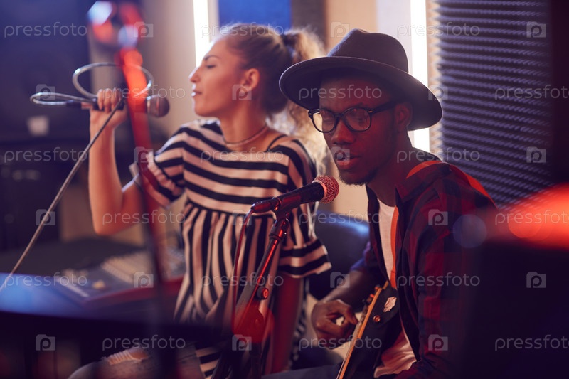 Молодой африканский мужчина поет с группой в студии
