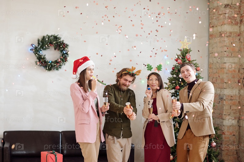 Веселые молодые коллеги в рождественских головных уборах стреляют печеньем и веселятся