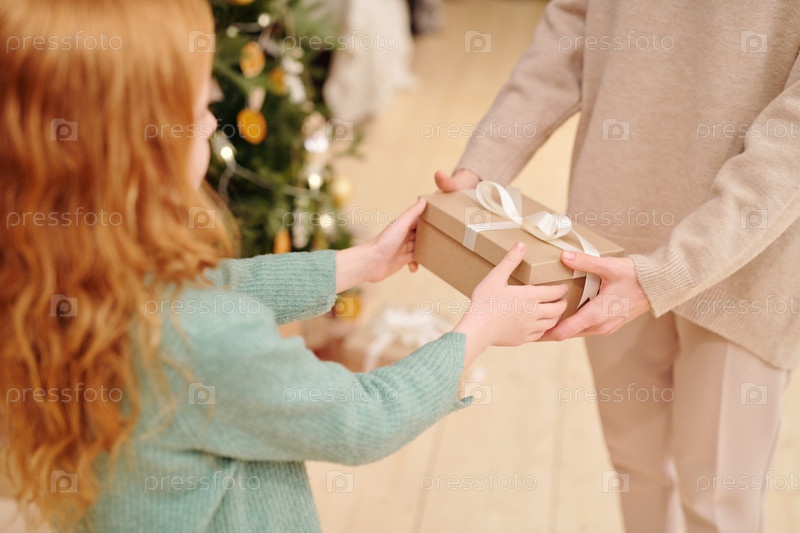 Маленькая девочка в повседневной одежде берет подарочный ящик с рождественским подарком от своей матери