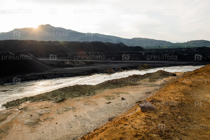 Ландшафт заброшенной территории с грязной водой в реке и загрязненными почвами