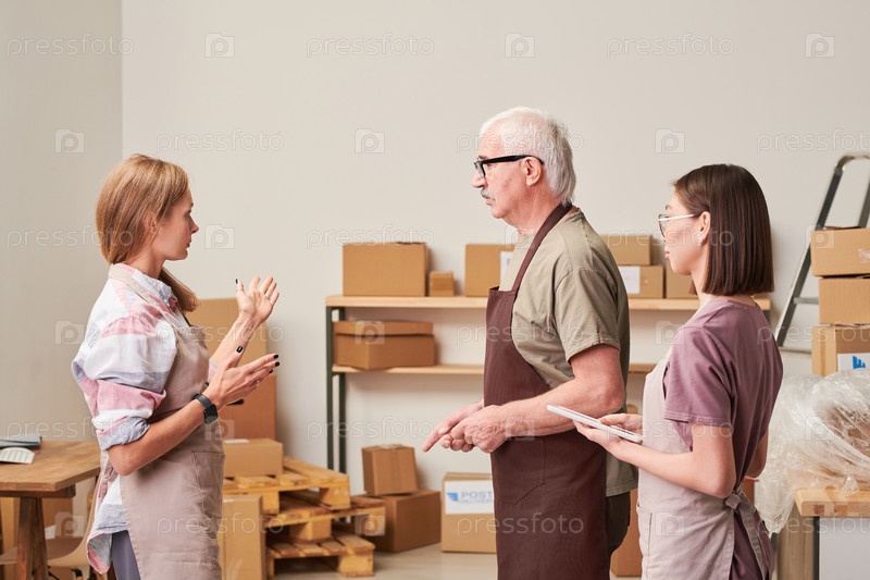 Молодой менеджер склада в фартуке жестикулирует руками, объясняя обязанности новому старшему работнику на складе интернет-магазина