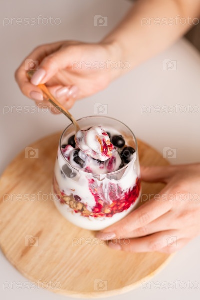 Руки молодой здоровой женщины, имеющей свежий самодельный йогурт на завтрак