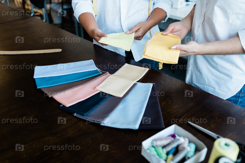 Руки двух молодых дизайнеров, выбирающих образцы текстиля для новой модной коллекции