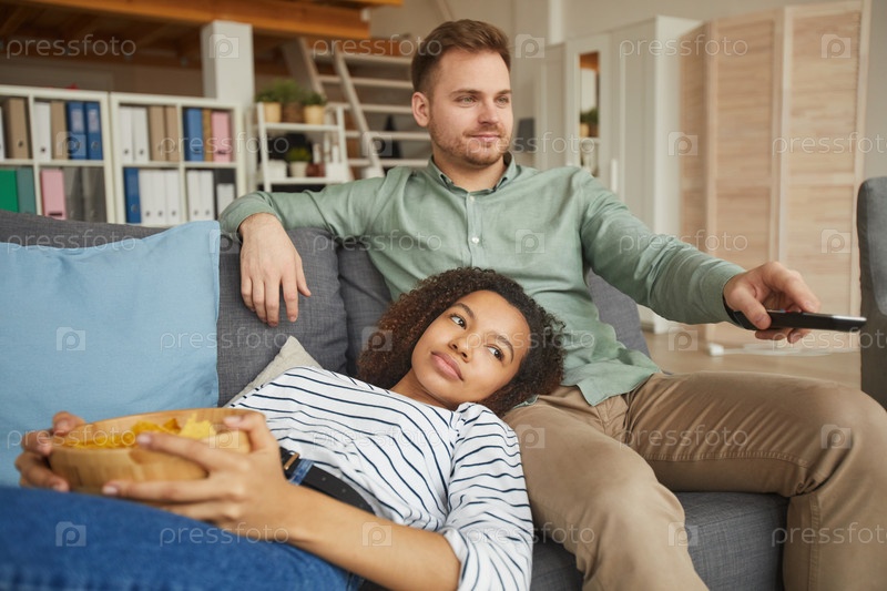 Молодая пара отдыхает на диване рядом с телевизором