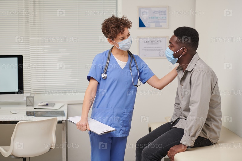 Горизонтальный средний длинный снимок современной женщины-врача, носящей защитную маску и утешающей своего афроамериканского пациента