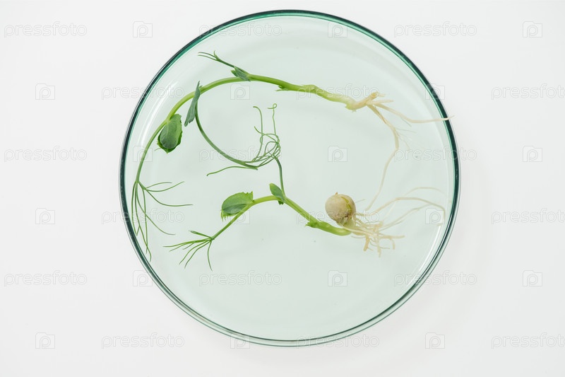 Обзор чаши Петри, содержащей два лабораторно выращенных соевых побега, стоящих на столе