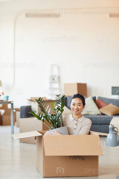 Молодая азиатская женщина сидит в картонной коробке в новом доме
