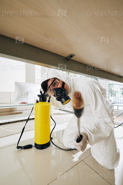 Работник опрыскивает каждый уголок дезинфицирующим средством