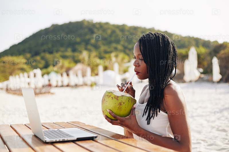 Женщина пьет освежающую кокосовую воду
