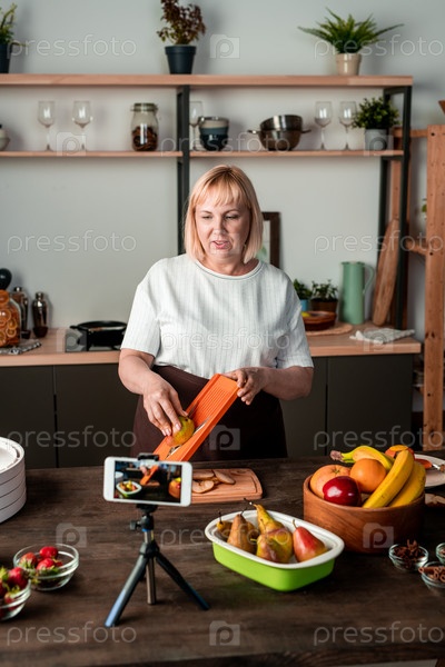 Случайная домохозяйка режет свежие груши на доске для нарезания у кухонного стола