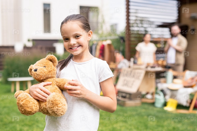 Улыбающаяся девушка с игрушечным медведем