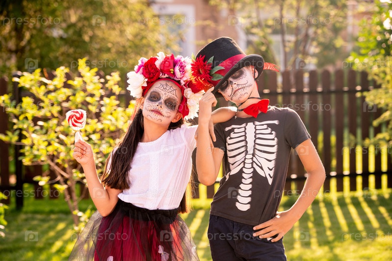 Милые дети с покрашенными лицами стоят рядом друг с другом перед камерой