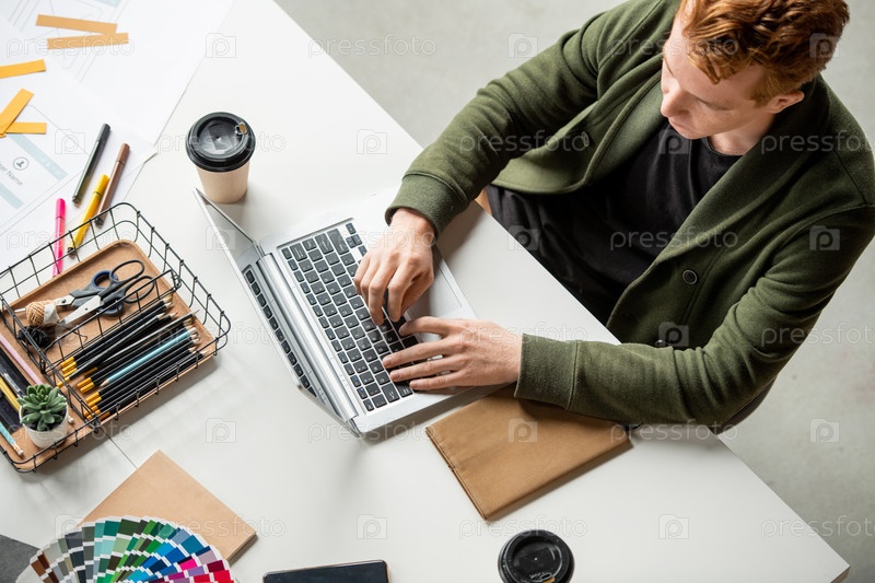 Молодой современный разработчик программного обеспечения нажимает кнопки клавиатуры ноутбука по столу