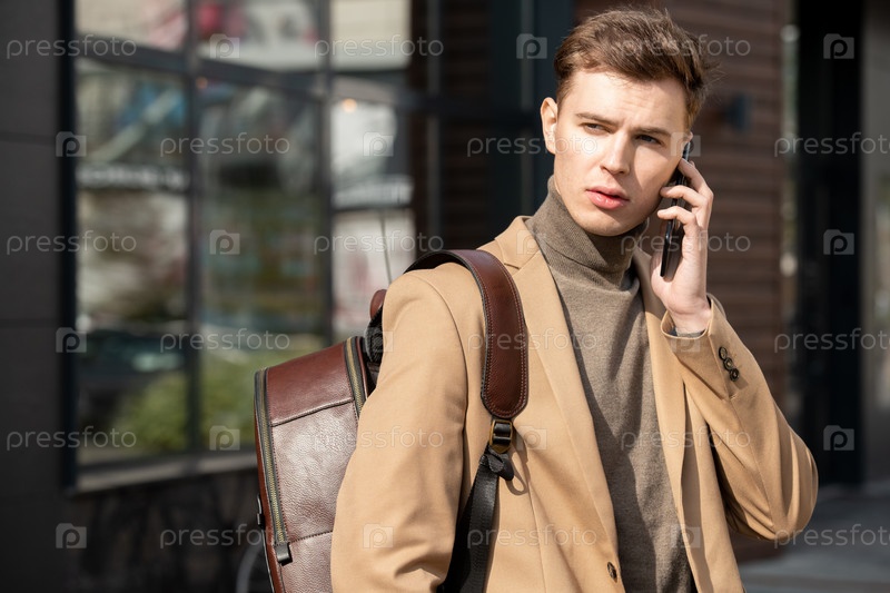 Молодой элегантный бизнесмен в бежевом куртке и сером свитере разговаривает со смартфоном
