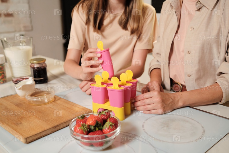Подростковая девочка кладет силиконовую форму, наполненную домашним мороженым, другим
