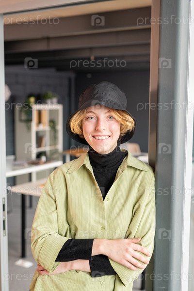 Молодая жизнерадостная бизнес-леди в повседневной одежде смотрит на вас с зубчатой улыбкой
