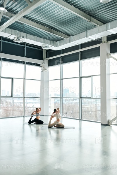 Молодые активные женщины в спортивной одежде практикуют йогу, упражнения на ковриках