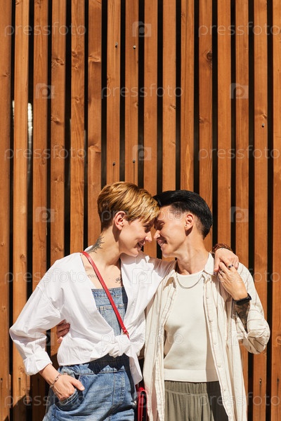 Счастливые лесбиянки обнимаются на свежем воздухе