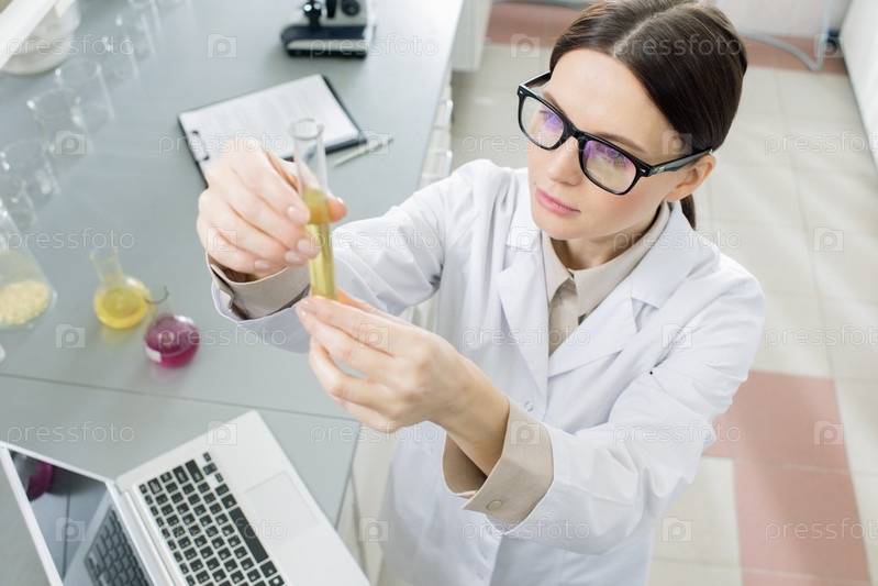 Лабораторный работник смотрит на колбу с жидким веществом во время изучения новой вакцины