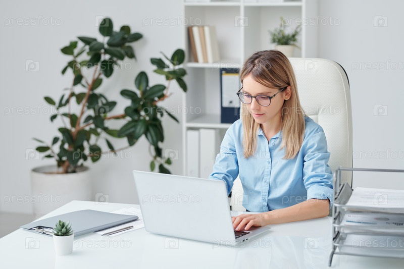 Красивая молодая бизнес-леди смотрит на данные на дисплее ноутбука и анализирует их