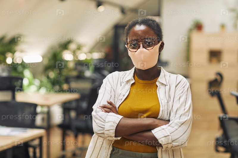 Афроамериканская женщина, носящая маску в офисе