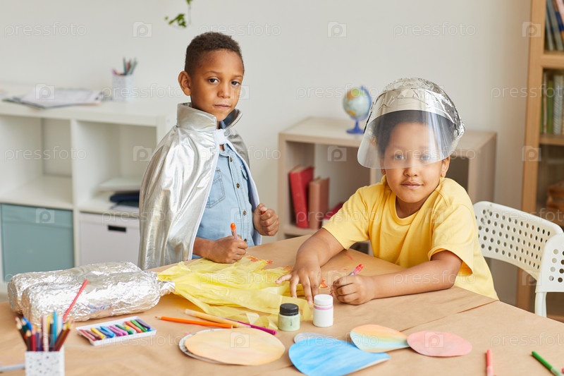 Два афроамериканских мальчика изготавливают космические костюмы