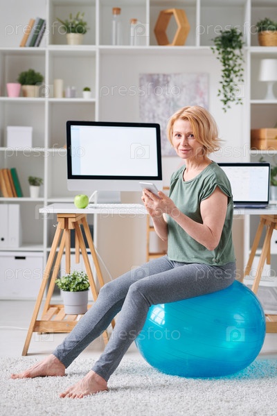 Довольно зрелая женщина со смартфоном, ищущая онлайн-курс фитнеса