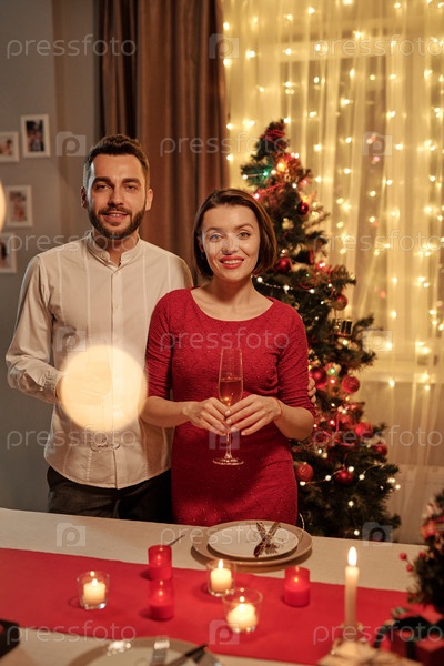 Счастливая пара с шампанским, стоящая за плохим столом против рождественской елки