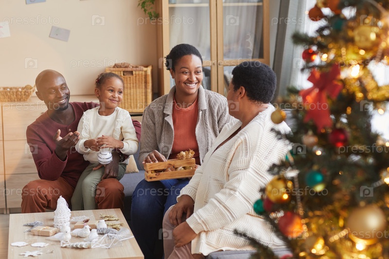 Большая афроамериканская семья украшает Рождество