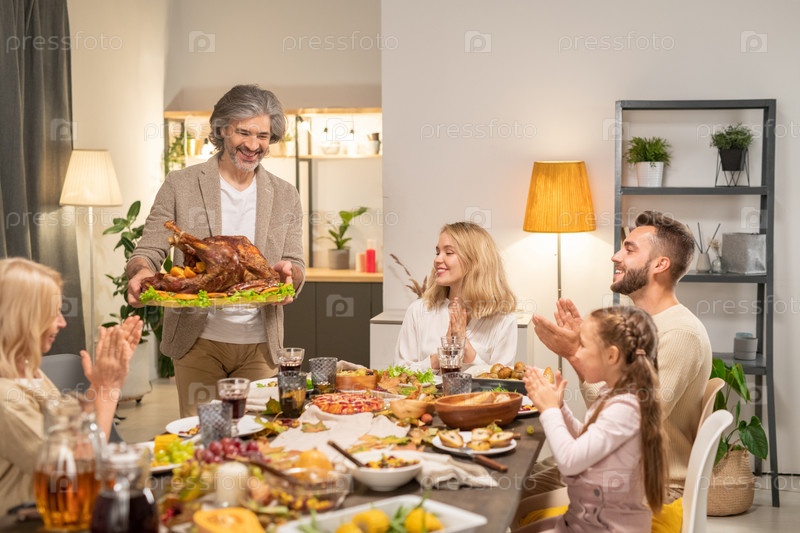 Веселая семья сидит за столом, где подают домашнюю еду и хлопают в ладоши