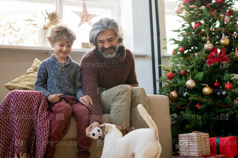 Счастливый старший мужчина и его милый внучек играют с собакой у рождественской елки