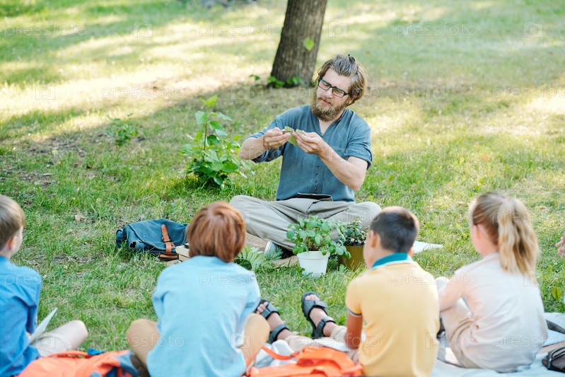 Улыбающиеся дети с учителем на открытом воздухе