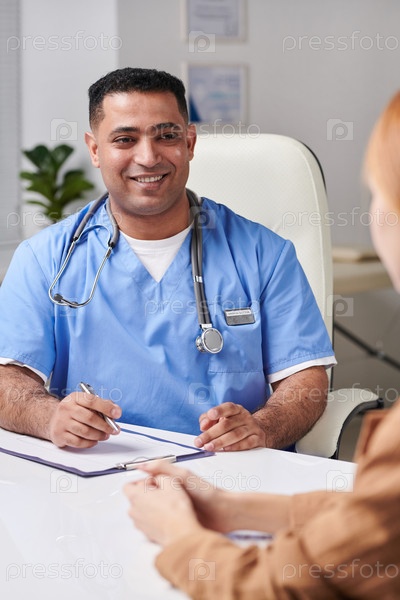 Вертикальный снимок молодого взрослого медицинского работника Ближнего Востока в голубой форме, сидящего за столом в своем офисе перед неизвестной женщиной-пациентом, разговаривающей с ней