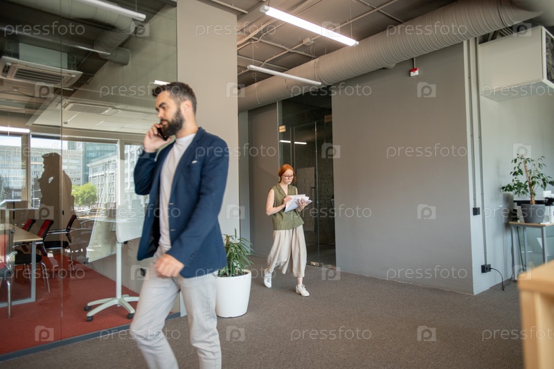 Молодой бизнесмен в умной повседневной одежде разговаривает на мобильном телефоне в офисе