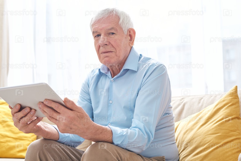 Серьезный старший мужчина в повседневной одежде смотрит на вас, используя цифровой планшет