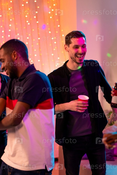 Смеющийся парень с красным стеклом танцует и наслаждается домашней вечеринкой со своими друзьями