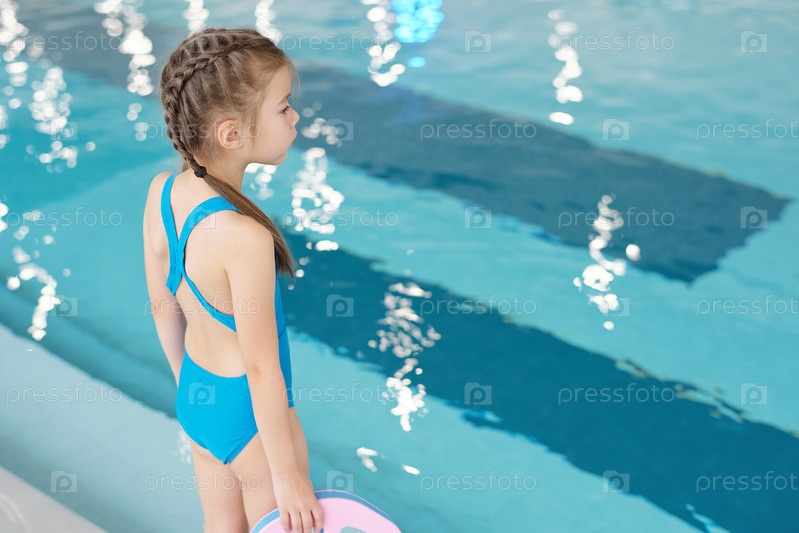 Милая девочка в синем купальнике смотрит на прозрачную воду в бассейне