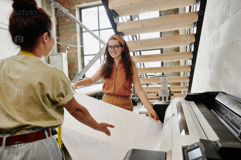 Две молодые модные дизайнеры печатают эскизы под лестницей в студии