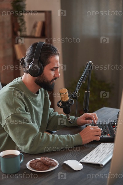 Вертикальный портрет молодого ближневосточного влиятельного человека, сидящего за столом в комнате на чердаке и создающего контент для блога