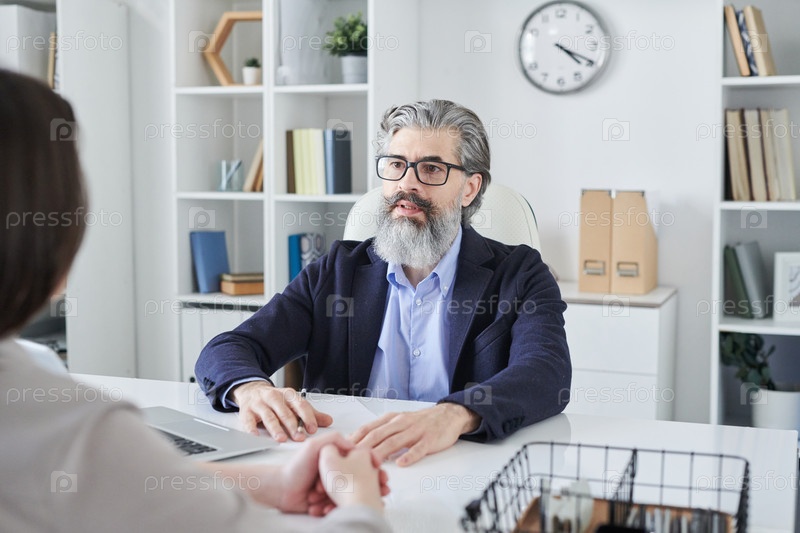 Зрелый бородатый мужчина-профессионал в очках и формальной одежде, который смотрит на клиента