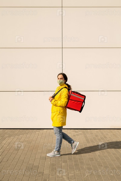 Красивый молодой курьер в рабочей одежде и защитной маске стоит на белой стене