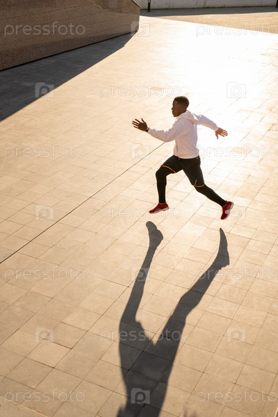 Молодой активный спортсмен в капюшоне, кроссовках и штанах бежит по плиточной тротуару
