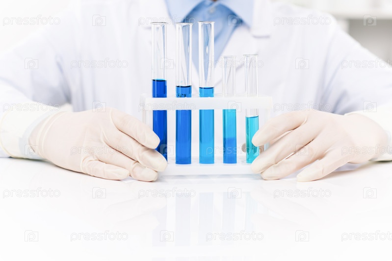 Перчатки рук современного клинициста, сидящего за столом и работающего с жидкостями
