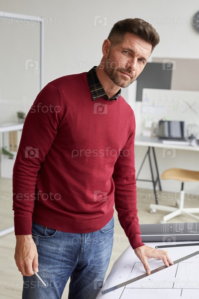 Бородатый архитектор позирует на рабочем месте