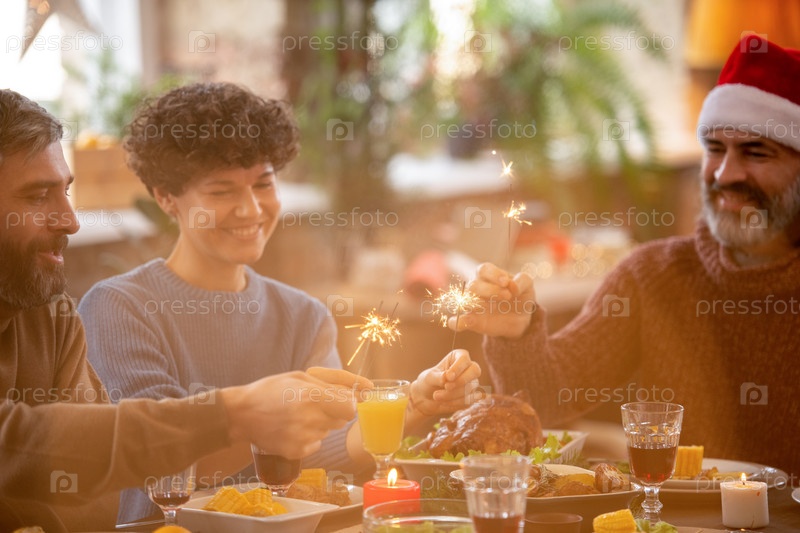 Два счастливых мужчины и жена одного из них, держащих бенгальские огни над праздничным столом